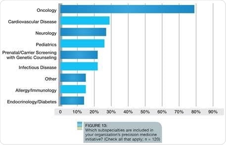 More than 72 percent of respondents from organizations with ongoing precision medicine initiatives said they are using next-generation sequencing (NGS) variant panels. There is a growing interest in additional data types, including more complex NGS, whole genome sequencing, and other omics data types. The study also found that nearly 80 percent hope they will be able to fully leverage large, more complex datasets to identify new insights and improve treatment recommendations by implementing these technologies in the future.