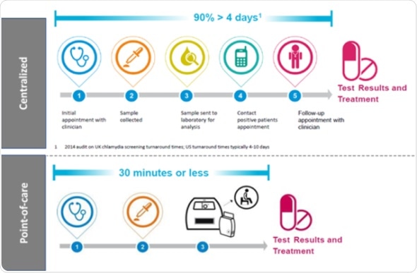 Timescales for the diagnosis of a sexually transmitted infection, chlamydia, via centralized and point-of-care testing (Source: Atlas Genetics).