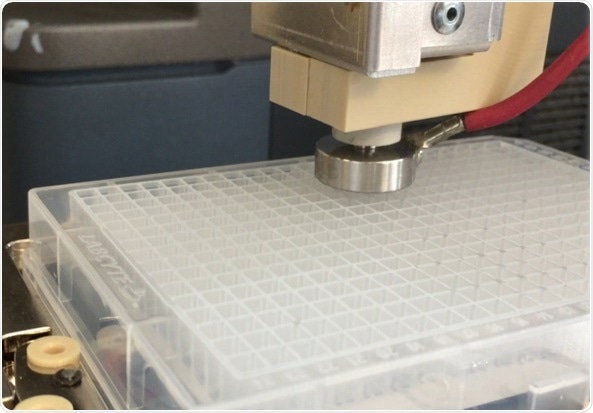 Fundamentally, we've taken the LabCyte 555 and essentially taken the transducer from inside and brought it outside the instrument, then coupled this to a plate transfer system so that the plate can now move around over the top of this transducer.