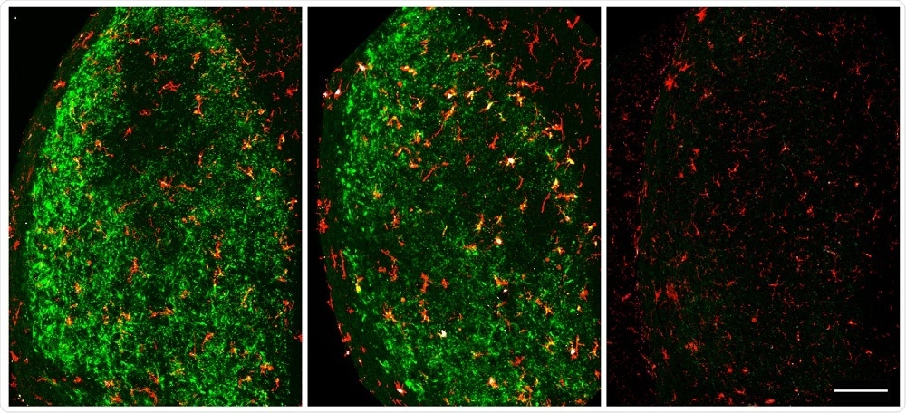The team found that this debris is engulfed by microglia, phagocytic cells that reside in the central nervous system where they gobble up pathogens that have infected the brain.