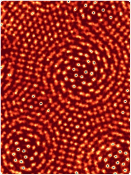 A ptychographic image of two sheets of molybdenum disulfide, with one rotated by 6.8 degrees with respect to the other. The distances between individual atoms range from a full atomic bond length down to complete overlap. Image courtesy of Prof. David Muller.