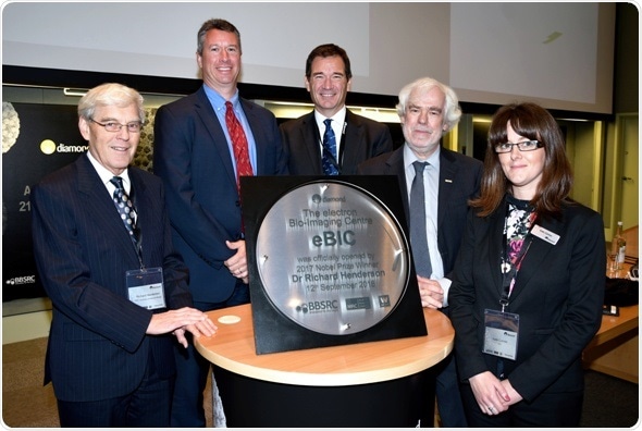 L to R Dr Richard Henderson, Laboratory of Molecular Biology, Cambridge and one of the recipients of the 2017 Nobel Prize for Chemistry winner; Dan Shine, Senior Vice President, Thermo Fisher Scientific; – Professor Andrew Harrison, CEO Diamond Light Source; Professor Dave Stuart, Life Sciences Director at Diamond and MRC Professor of Structural Biology at University of Oxford; and Katie Cunnea, the Electron Bio-Imaging Center's (eBIC's) Senior center coordinator; at the official opening of the new national electron bio-imaging center (eBIC) at Diamond Light Source, the UK’s national synchrotron