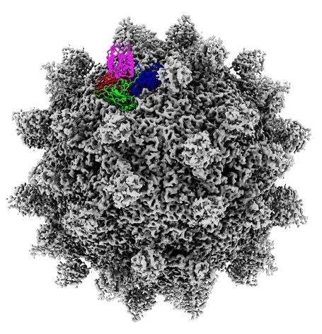 A cryo-EM map of the receptor decorated capsid in which a single protomer was replaced with the atomic model. Seneca Valley Virus capsid proteins are shown in blue, green, and red, and the ANTXR1 receptor is shown in magenta. Credit: OIST and University of Otago
