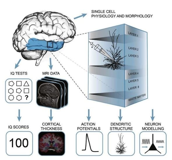 Summary of the approach: The scientist were able to collect an information-rich multidimensional data set from human subjects including single cell physiology, neuronal morphology, MRI and IQ test scores. The area of the brain highlighted in blue indicates the location of cortical thickness measurements, The black square indicates the typical origin of resected cortical tissue. Credit: H. Mansvelder/HBP