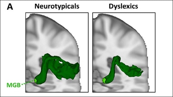 Neural fibers connect a subcortical structure in the auditory pathway — the left medial geniculate body (MGB) — to part of the cerebral cortex called the motion-sensitive planum temporale (mPT). Nadja Tschentscher and colleagues present evidence that the strength of this pathway is reduced in adults with dyslexia compared to typical readers. The researchers found left MGB-mPT connectivity was associated with reading fluency only in typical readers, while previous studies reported associations between an analogous visual pathway and reading ability in both dyslexics and typical readers. Taken together, the results broaden our understanding of dyslexia — one of the most common learning disabilities — to include alterations in lower as well as higher brain structures.