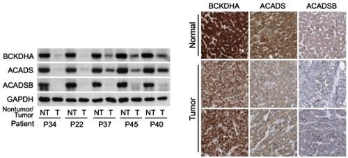 Figure 1- On the left is Western blot analysis on non-tumor (NT) and tumor (T) tissues from HCC patients enrolled at NCCS, showing a sharp decrease in expression of three important BCAA catabolic enzymes (The GAPDH enzyme was used as loading control). On the right are images of normal liver tissues or HCCs stained with antibodies for the three BCAA catabolic enzymes. The images were obtained from the Human Protein Atlas. Normal liver tissues typically have high expression (dark brown), while tumors have weak expression, confirming results from the NCCS cohort.