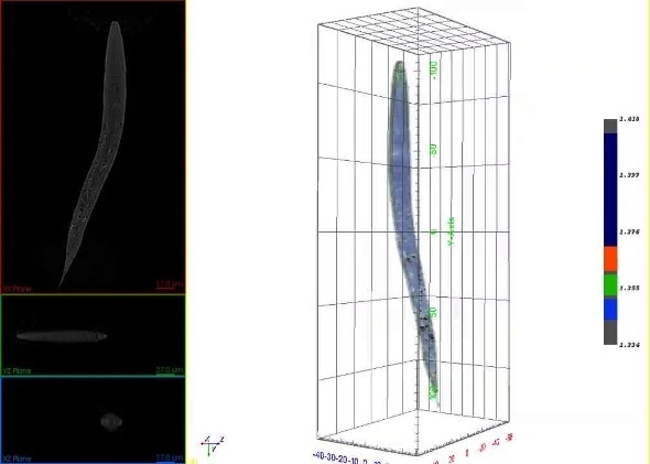 Label-free 3D image of C. elegans: this single, high-resolution frame from the captured video shows the large 3D whole worm image of C. elegeans, acquired without labelling using the Tomocube holotomography microscope equipped with motorized stage.
