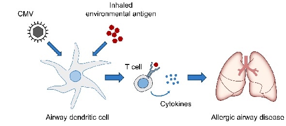 CMV infection of the airways activates dendritic cells for a more efficient uptake of inhaled environmental antigens of otherwise low-to-no intrinsic allergenic potential. This mechanism sensitizes detrimental immune cells that can cause allergic airway disease after antigen re-exposure.”