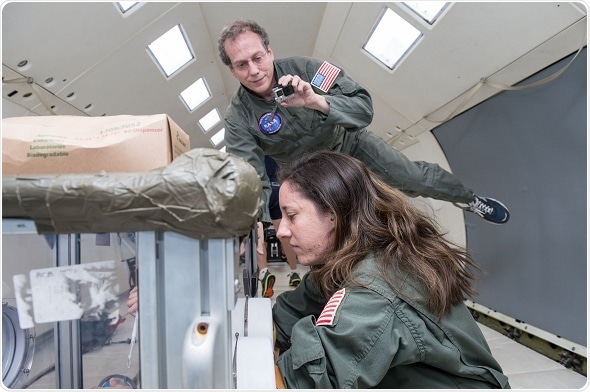 Andrew Feinberg and Lindsay Rizzardi test procedures for storing blood samples on NASA’s microgravity plane called the “Vomit Comet.” Credit: Johns Hopkins Medicine