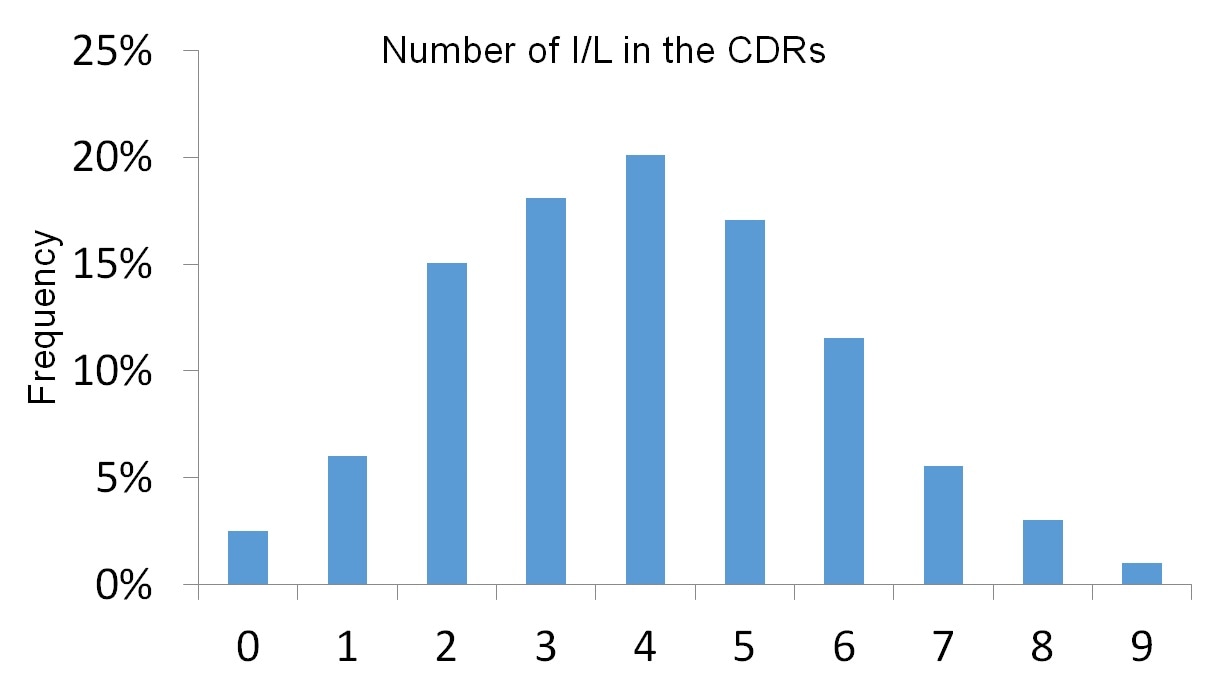Figure 2. Frequency of antibodies expressing a given number of Isoleucine (I) or Leucine (L) residues in the complementarity determining region (CDR).
