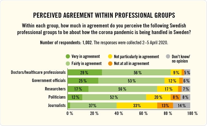 Health and other professional groups occasionally voice their discordant points of view when it comes to the way the government is dealing with the crisis. The survey reports that, nonetheless, 85% of Swedes think there is reasonable agreement among doctors and other healthcare professionals about the course of management.