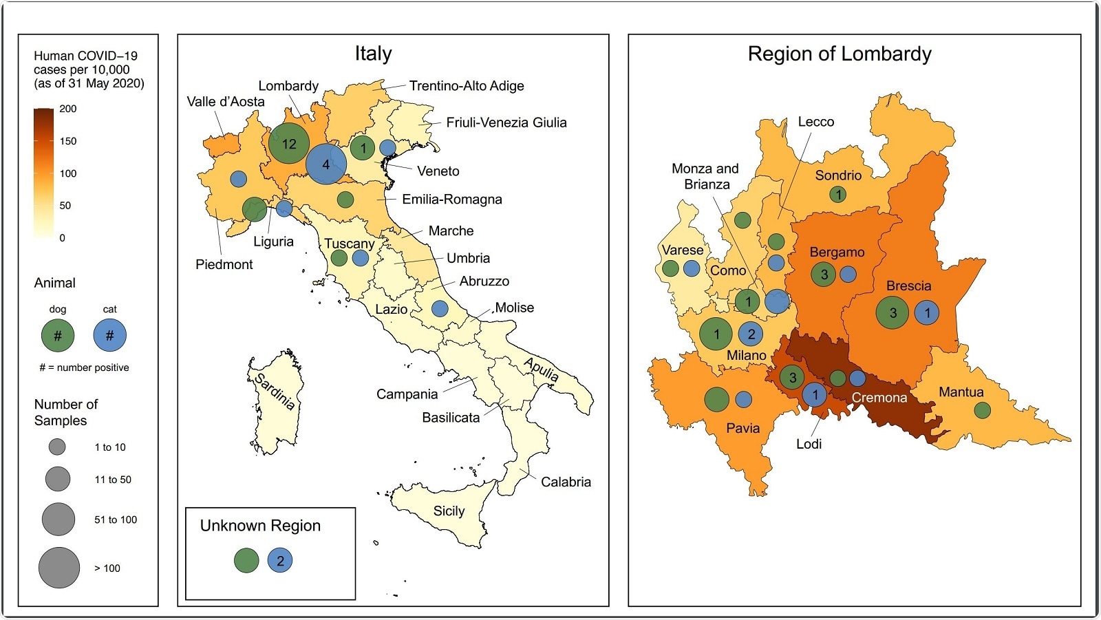 Some important associations were made. When there were 10 or more samples available, the human case count was strongly and positively correlated with the positive tests in dogs, and also with cats, but to a smaller and less significant extent. Community sampling in humans yielded a comparable seropositivity percentage at a similar period in Europe.