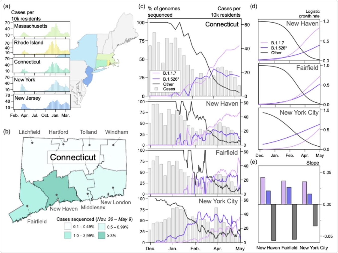 While both the Alpha and Iota variants were circulating throughout this area of the U.S. at the same time, the Alpha variant was growing at double the rate of the Iota variant both in New York and in New Haven County in Connecticut. Comparably, in the neighboring county of Fairfield in Connecticut, the Alpha variant showed a 37% higher growth rate as compared to the Iota variant.