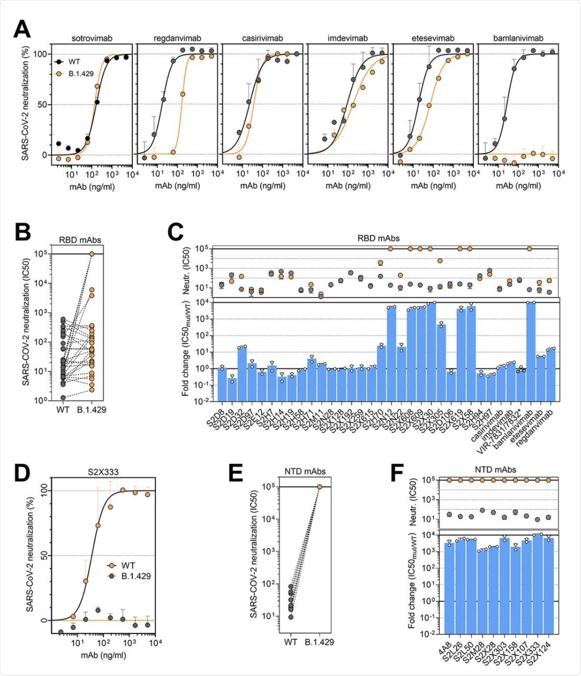 Among the panel of 34 mAbs directed against the RBD, including six that are currently in clinical use, 14 showed a reduction in neutralizing potency against B.1.427/B.1.429 as compared to D614. Of the six clinical mAbs, bamlanivimab (LY-CoV555) was found to lose its neutralizing activity completely, while two others (etesevimab (LY-CoV016) and, more significantly, regdanvimab (CT-P59), showed reduced potency.