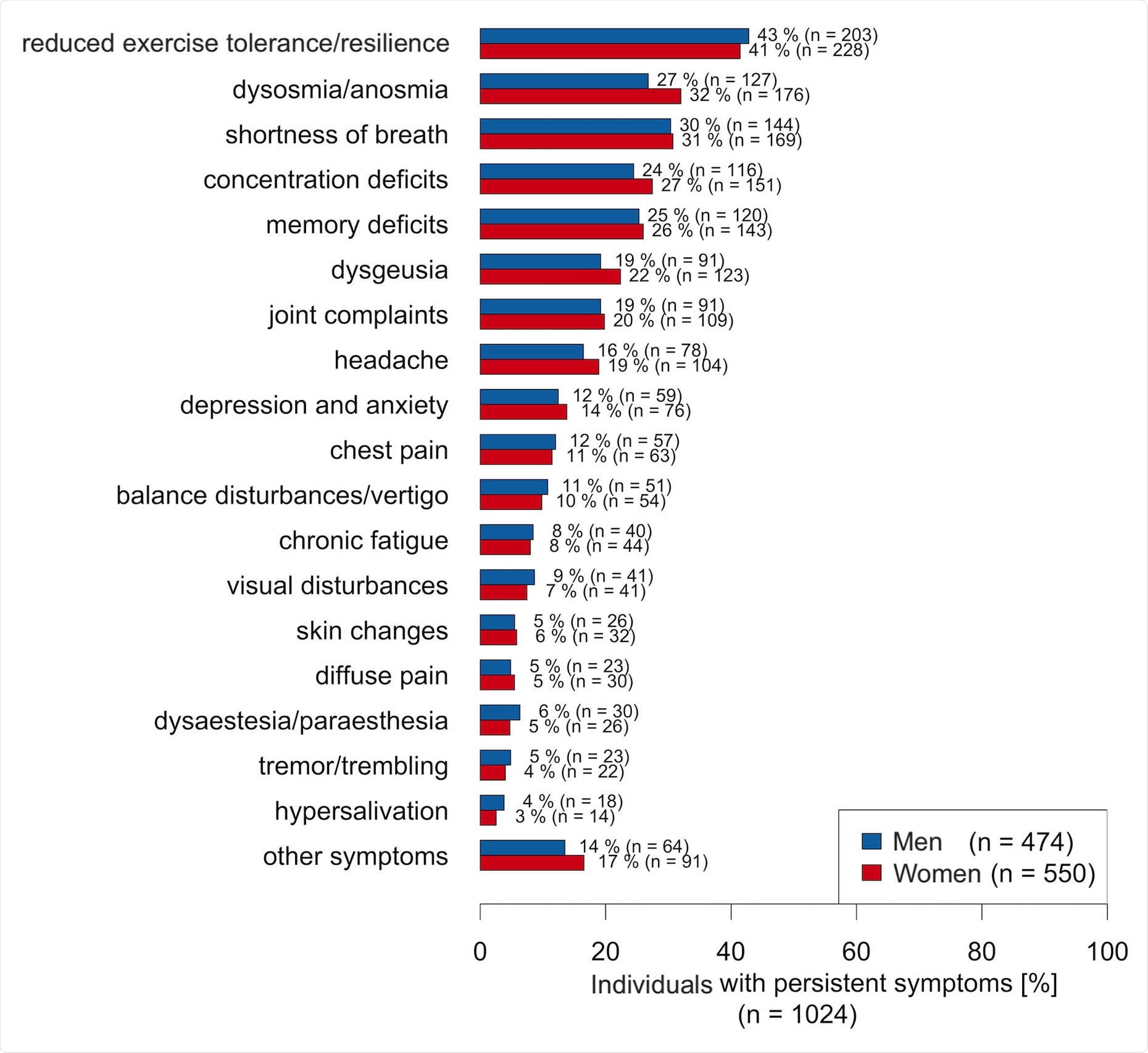 During the mean follow-up time of 197 days, 36.8 percent of the individuals reported at least one persistent symptom. Also, of the 152 people hospitalized at least once for persistent symptoms, 66 were women and 86 men.