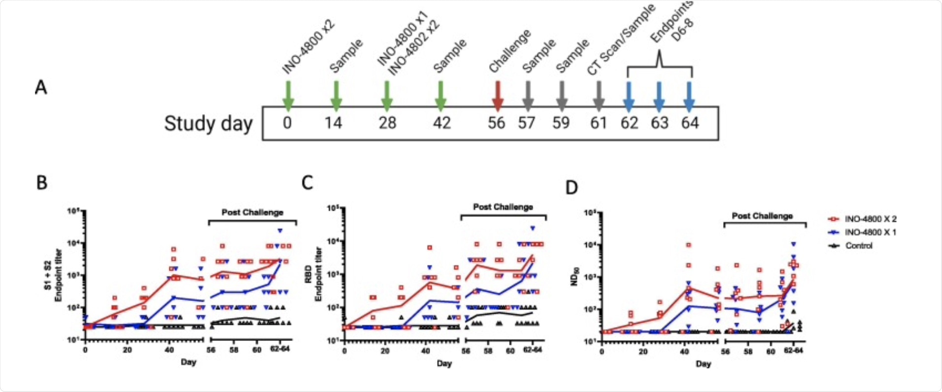 Humoral responses in rhesus macaques vaccinated with INO-4800. Study outline (A). SARS-CoV-2 Spike-specific IgG (B), RBD-specific IgG (C) and live virus-neutralising antibodies (D) measured pre- and post-challenge in serum from rhesus macaques that received 1 or 2 doses of INO-4800 or were unvaccinated (Control). Lines represent the geometric means.