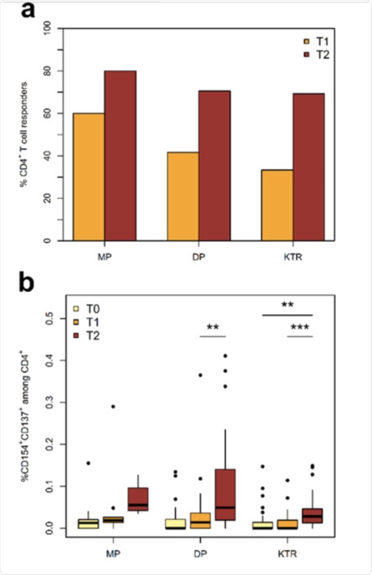 Post-vaccination, KTR patients showed a significant delay in T-cell responses, similar to DP patients. However, a marked increase was observed after the booster vaccine dose.