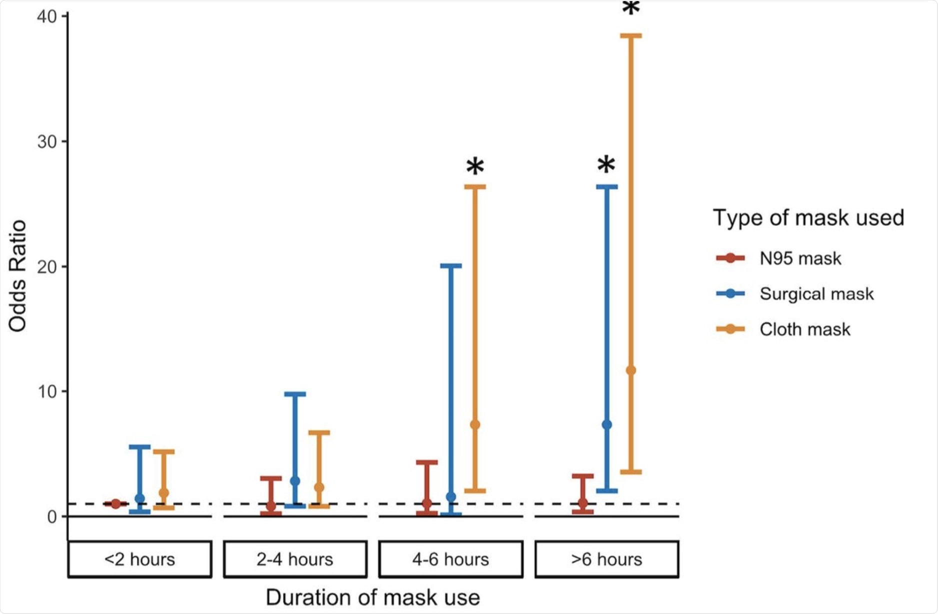 Risk of Coronavirus disease-associated mucormycosis depends on the type of mask as well as duration of usage. * represents significant difference compared to use of N95 mask for <2 hours.