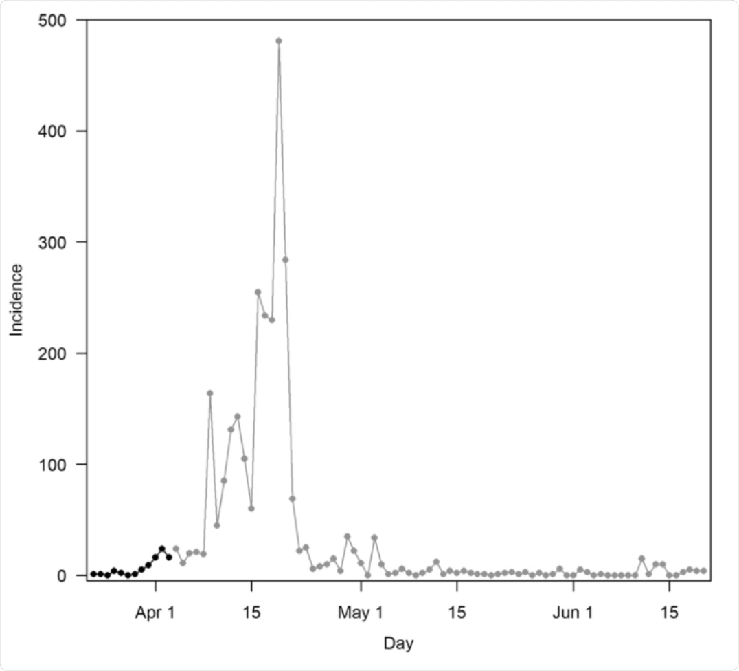 Outbreak trajectory in the dormitory. Observed symptomatic cases with onset on or before Apr 3, 2020(black dots, up to day 12 of the outbreak) were used for model fitting. Cases after Apr 3, 2020 (grey dots) were plotted based on notification dates if onset dates were not available and were not used for model fitting.