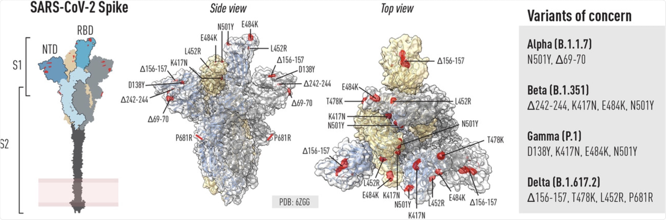 Schematic of the SARS-COV-2 spike glycoprotein and location of mutations in VoCs. Left: Schematic of the spike trimer highlighting key domains including the RBD, NTD and S2. Right (side and top view): ChimeraX was used to illustrate selected residues in the spike trimer that are mutated in selected VOCs known at the time of writing. Mutations can be common or unique to different VOCs.