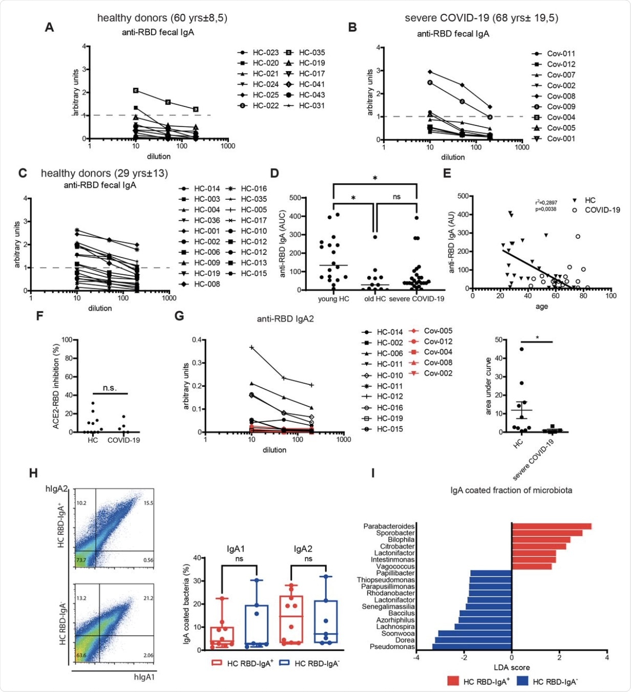 Levels of anti-RBD IgA in fecal supernatants of age-matched healthy (A) and severe COVID-19 (B) individuals. (C) Levels of anti-RBD IgA in fecal supernatants of young healthy individuals. (D) Area under the curve (AUC) values for the anti-RBD IgA ELISA measurement of the donors presented in (A-C). (E) Correlation of the levels of anti-RBD IgA with the age in healthy individuals and COVID-19 patients. Inhibition of RBD binding to ACE2 by IgA purified from feces of healthy people and severe COVID-19 patients. (G). Levels and AUC values of anti-RBD IgA2 in purified IgA fraction from healthy and severe COVID-19 individuals. (H). Representative dot plots and quantification of fecal IgA coating from healthy individuals that have anti-RBD IgA (HC RBD-IgA+) or lack anti-RBD IgA (HC RBD-IgA-). (I) Linear discriminant analysis (LDA) scores of the IgA bound bacterial fraction isolated from HC RBD-IgA+ and HC RBD-IgA-. *, p<0.05, **, p<0.01, ***, p<0.001, as calculated by unpaired t-test (F, G, H) or by Kruskal-Wallis test with Dunn’s multiple comparisons (D); ns, not significant.