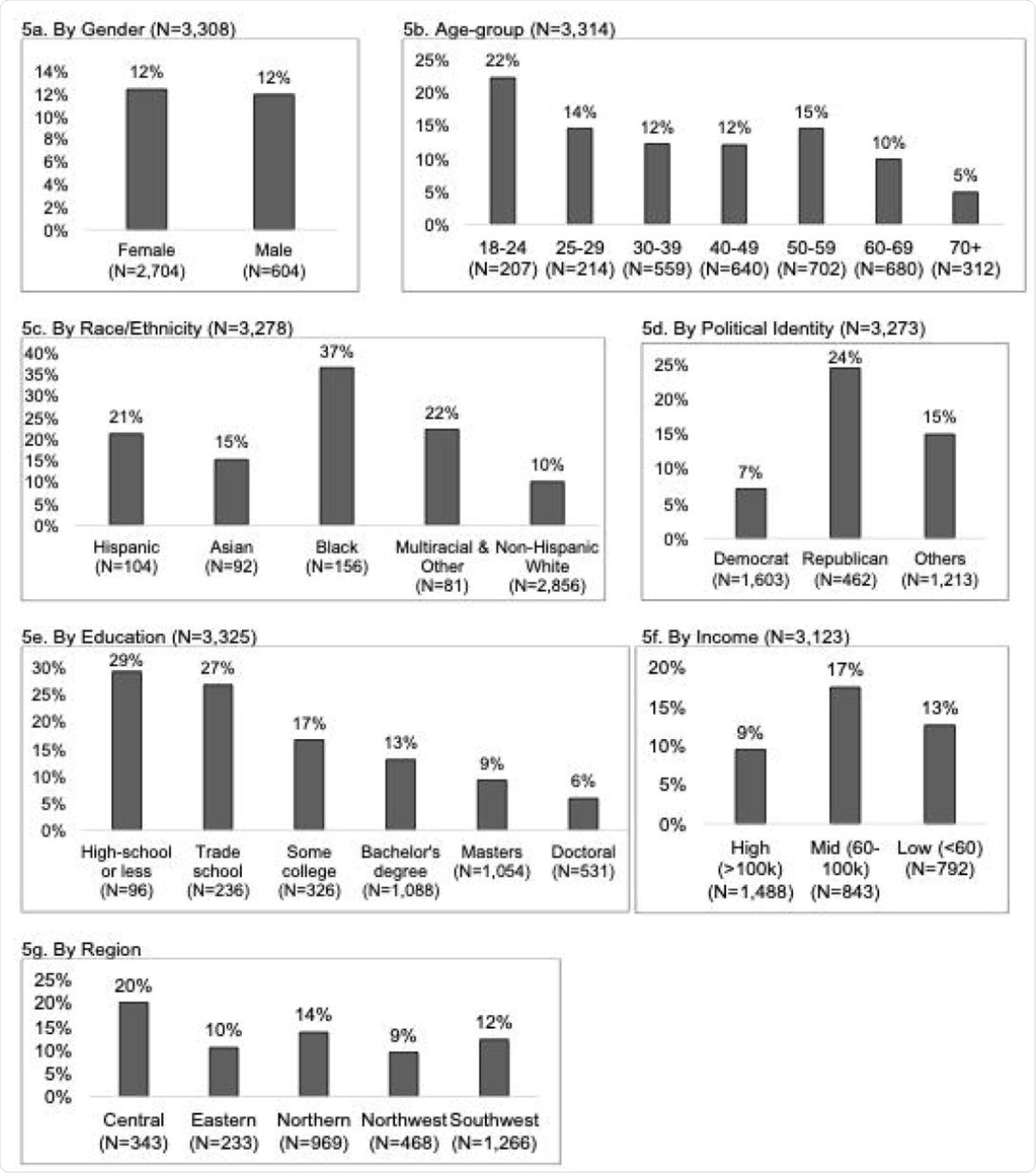 Percent of respondents who selected they believed in one or more alternative message when answering the question: “The following messages are related to the coronavirus/COVID-19 (not all are true). Please check all that apply if you have heard, believe, and/or changed your behavior based on each message” by gender (5a), age-group (5b), race/ethnicity (5c), political identity (5d), education level (5e), income level (5f), and Virginia region (5g). Alternative messages response options include: COVID-19 “was developed as a bioweapon,” “was developed to lower social security payments to seniors,” “is a sign of the apocalypse/end times,” “is a hoax,” “can be treated with natural remedies,” “was developed for population control,” and “was developed to increase sales of cleaning supplies.”