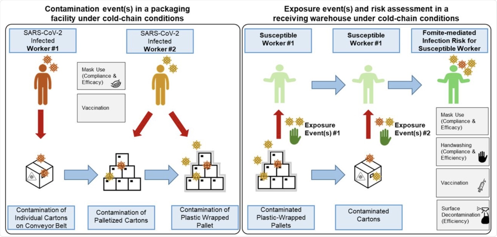 The researchers of the current study found that the risk of being infected while unpacking products in a cold chain in an individual who has no history of vaccination or infection is 2·8 x 10-3 per hour. This was reduced to a third by masking and further reduced to 1% by handwashing.