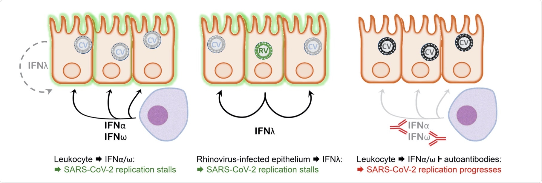 Model depicting the interaction between SARS-CoV-2 and the nasopharyngeal epithelium. Left: In a situation of asymptomatic infection or mild disease, mucosal leukocytes provide the IFN-I IFNα and IFNω for an inhibitory antiviral state. IFNλ production by the infected cells alone is insufficient in this situation. Middle: Infection with an RNA virus such as rhinovirus causes epithelial cells to produce sufficient IFNλ to cause an antiviral state in bystander cells that subsequently lose permissiveness for SARS-CoV-2 replication. Right: As in the left panel, but autoantibodies inhibit the leukocyte-derived IFN. Consequently, the epithelium remains permissive for SARS-CoV-2 replication, allowing for virus spread to the lower respiratory tract and favoring the development of severe pulmonary disease.