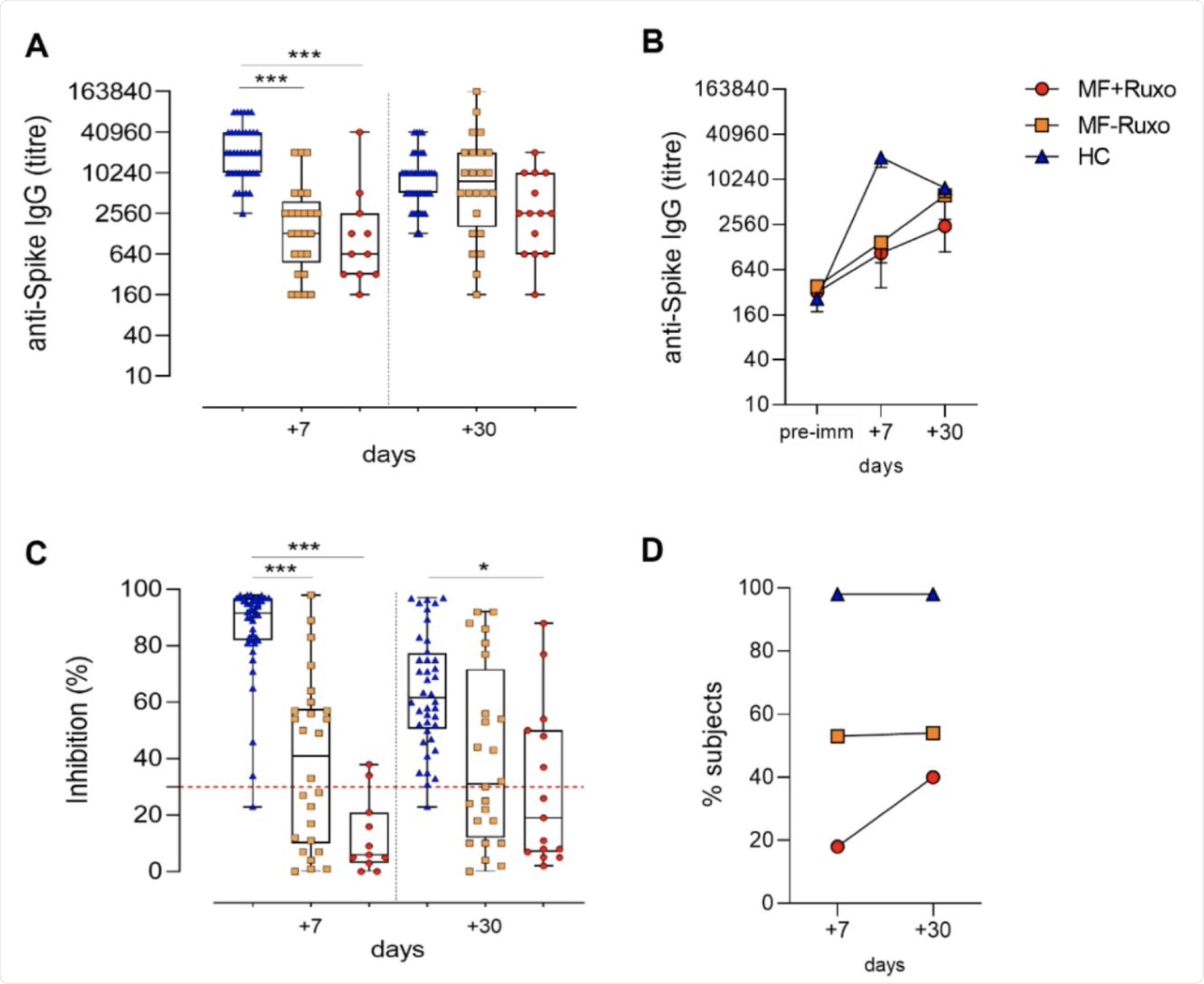 Almost all healthy controls showed over 30% inhibition at seven days and 30 days from the second dose. However, binding inhibition was especially low in patients treated with ruxolitinib, with less than one in five showing more than 30% inhibition at seven days and 40% at one month, compared to over half in MF subjects who were not on the drug.