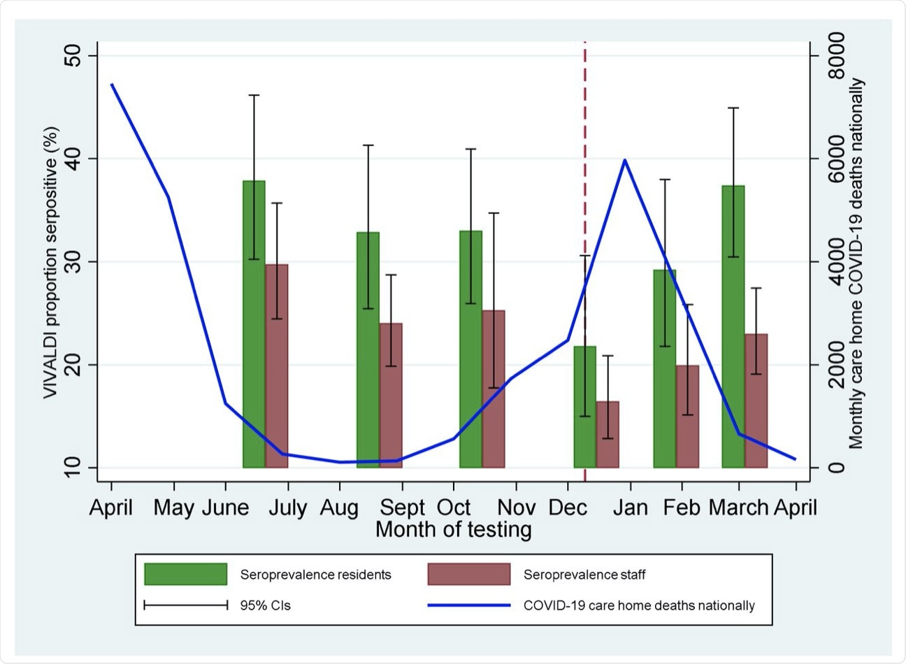 The highest seroprevalence came from the first two months of testing, between June and July 2020, immediately after the first wave. The lowest level was reported between December 2020 to January 2021, at 22% and 17% in residents and staff, respectively. By March and April 2021, these levels had risen again to 37% and 23%, respectively.