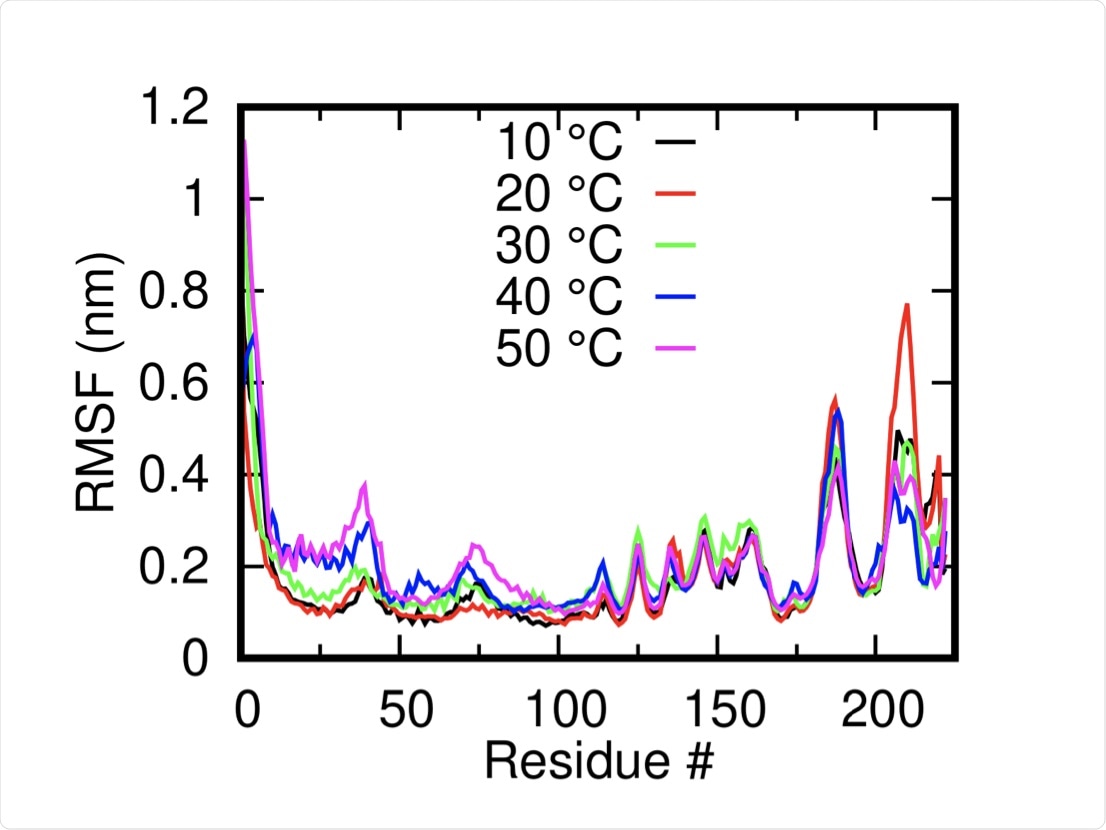 The root mean square of deviation is a measure of the conformational flexibility of a protein and was assessed at temperatures of 10˚C, 20˚C, 30˚C, 40˚C, and 50˚C in 150 nanoseconds (ns) long simulations. The system was found to be relatively stable at each temperature and was somewhat higher at elevated temperatures.