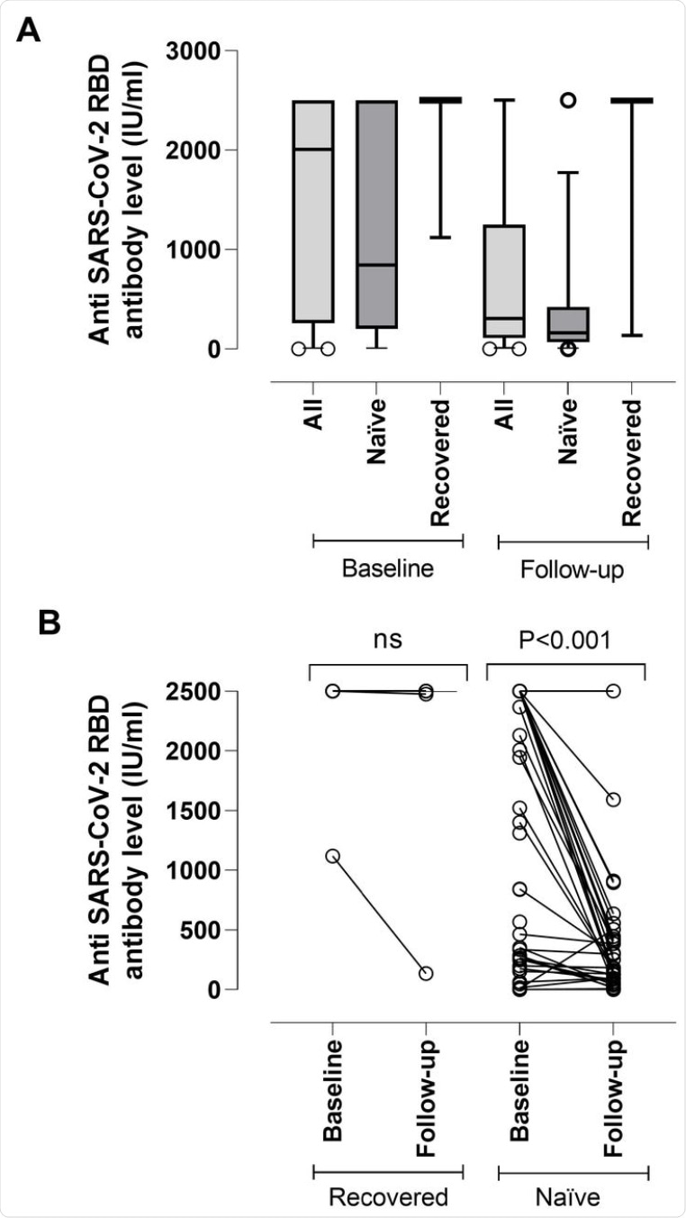 Overall, antibodies were found to decline by about 5-fold from the baseline to the follow-up period. Antibody waning was much more common among SARS-CoV-2 naïve residents as compared to those who had recovered from a previous SARS-CoV-2 infection.