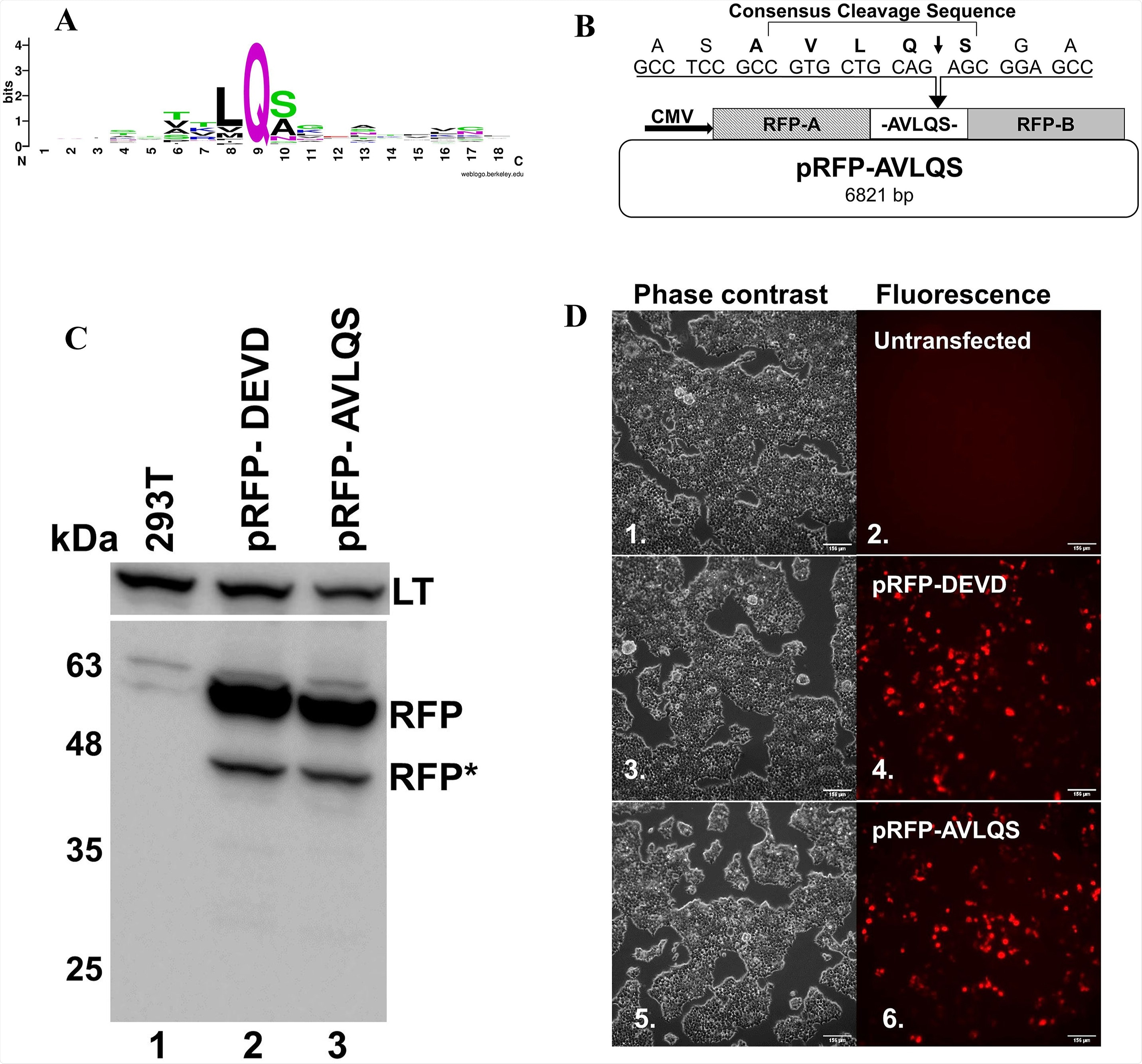 Creation and expression of an RFP biosensor to detect CoV2 Mprofunction: A) The consensus sequence for cleavage by Mpro, was computed using WebLogo version 3.0 using 77 cleavage sites, 11 each from SARS-CoV, MERS-CoV, SARS-CoV2, HCoV-229E, HCoV-NL63, HCoV-OC43 and HCoV-HKU1 (Supplemental Fig. 1). B) Graphic depiction of the pRFP-AVLQS vector, indicating the AVLQS cleavage site that was incorporated between the two RFP domains required to be tethered to allow for association and fluorescence. Expression of the RFP fusion protein is driven by the CMV promoter. C) Immunoblotting of HEK-293T cells untransfected (lane 1) or transfected with either the parental pRFPA1B1-DEVD vector (lane 2), or the pRFP-AVLQS vector (lane 3), for RFP (lower panel), or for SV40 Large T-antigen (LT, ∼94 kDa, upper panel) as a loading control. The heavy top band is the fluorescent RFP protein (RFP, ∼54 kDa) and the lower lighter band represents a breakdown product that is naturally produced upon expression in human cells (∼40 kDa RFP*) D) Phase contrast (odd) and fluorescence (even) images captured simultaneously using inverted microscopy demonstrate non-fluorescent untransfected cells (Cao et al., 2007), and similar levels of RFP fluorescence in cells transfected with either pRFPA1B1-DEVD or pRFP-AVLQS (compare 4 vs 6). Bar = 156 μm.