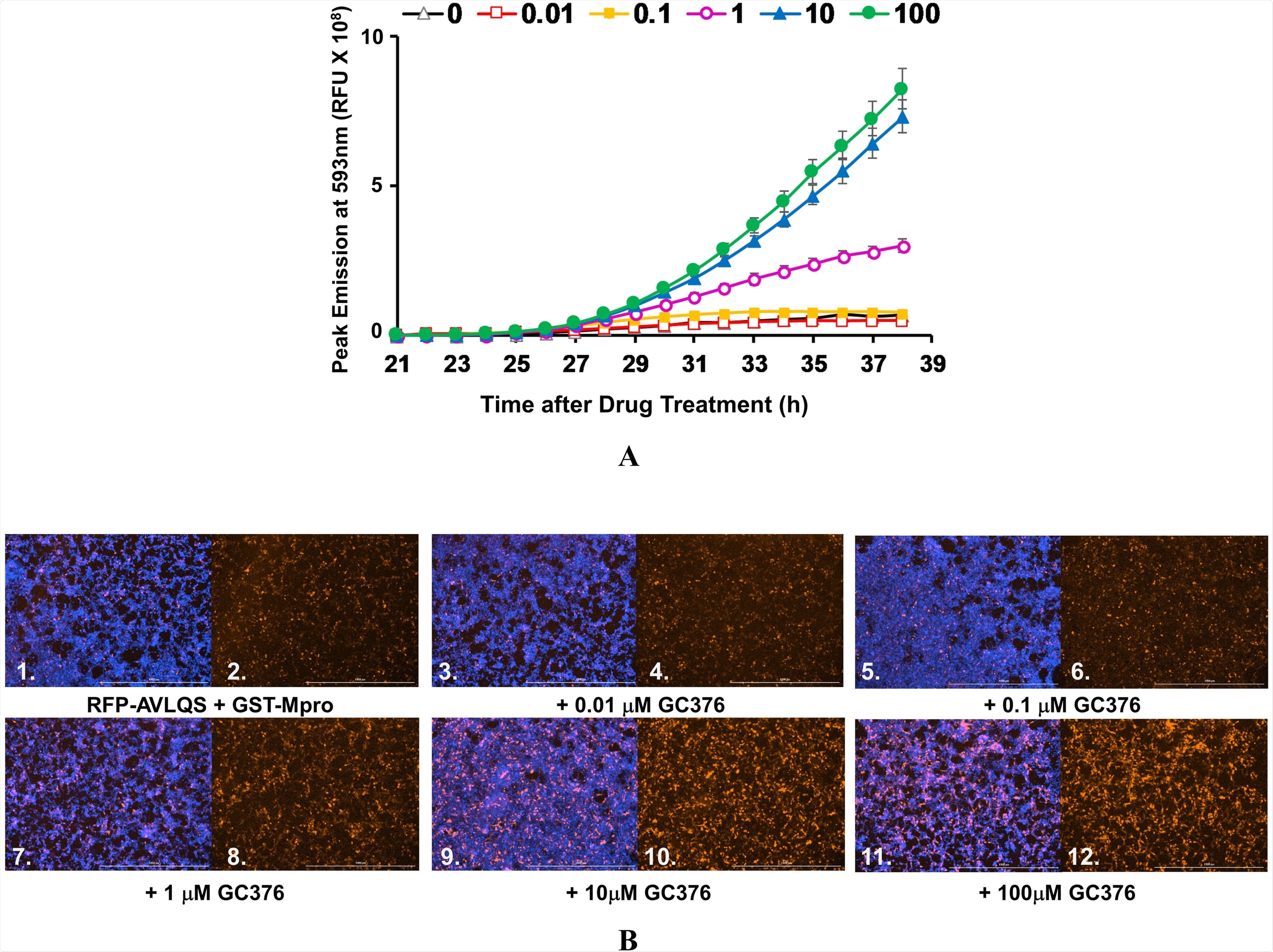 Evaluation of SARS-CoV-2 Mpro function took place with the help of a Mpro inhibitor known as GC376. Treatment of Mpro with ten-fold dilutions of 100 to 0.01 micromolar (µM) GC376 resulted in no cleavage of the biosensor, whereas treatment with 1 µM GC376 showed recovery of fluorescence levels. Thirdly, treatment with 10 and 100 µM GC376 showed high levels of RFP fluorescence recovery. No toxicity was observed following the treatment of cells with all concentrations of GC376.