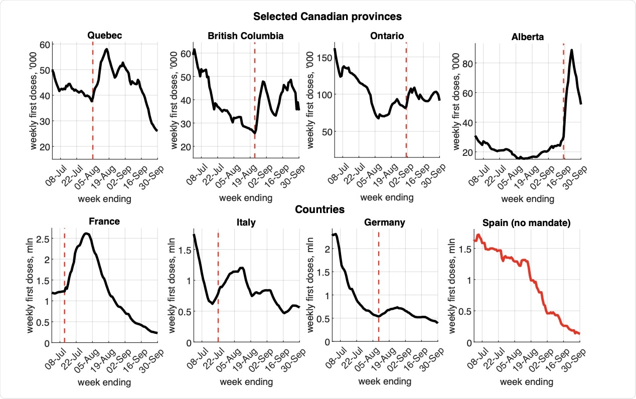 A new study published in the preprint server medRxiv* aimed to evaluate and quantify the effect of proof of vaccination mandates on first-dose vaccine uptake in nine Canadian provinces and three European countries including France, Italy, and Germany between July and September 2021.