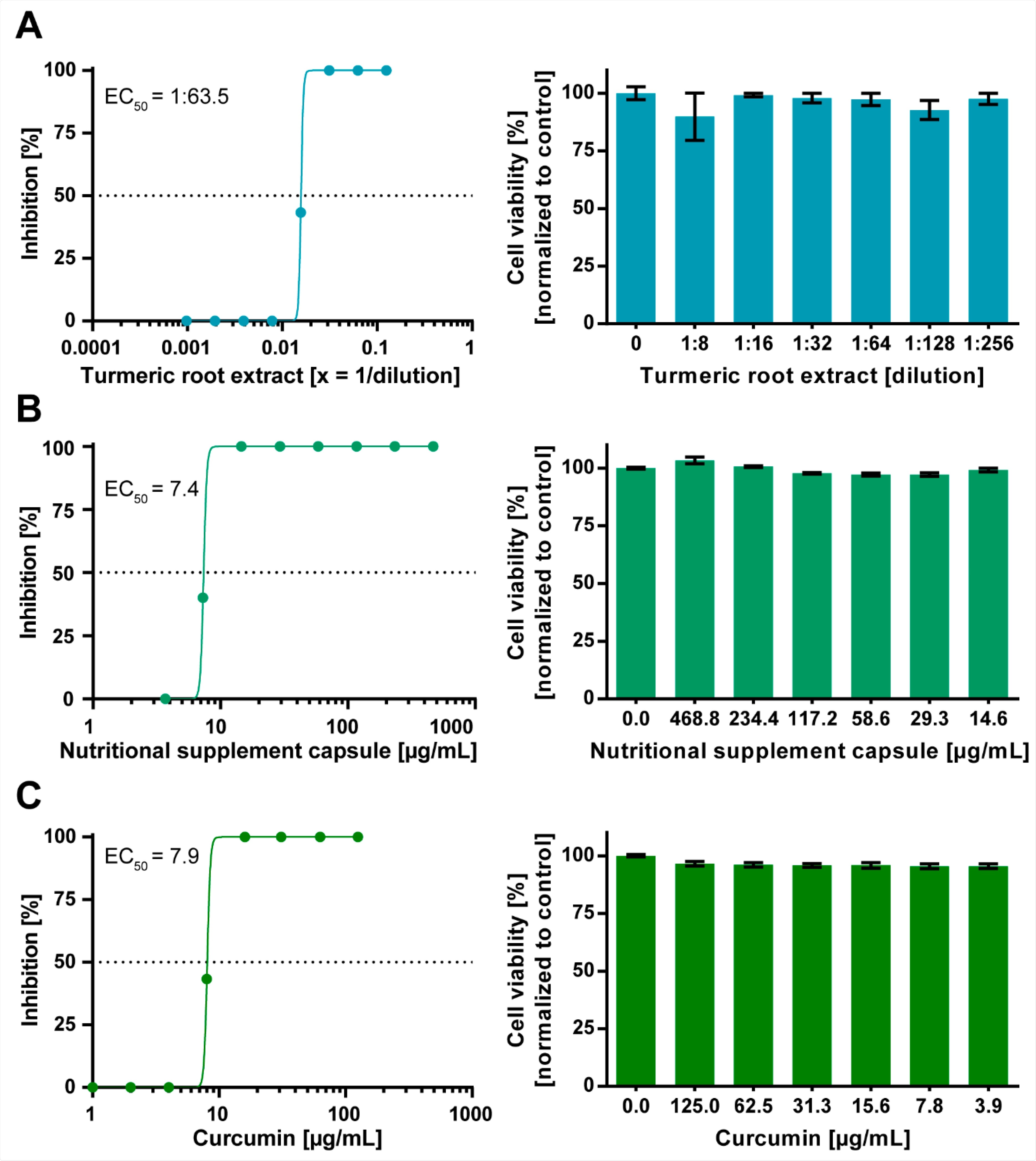 For determining the dose-dependent antiviral activity, the researchers determined the EC50 of turmeric root extract was achieved at a dilution of 1:63.5. Comparatively, the EC50 values of the capsules and curcumin were achieved at a concentration of 7.4 micrograms (µg)/mL and 7.9 µg/mL, respectively. No cytotoxic effect was observed.