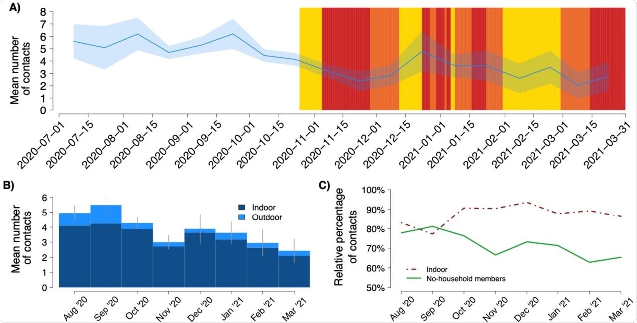 The researchers found an overall progressive temporal decrease in the mean number of contacts recorded by the study participants from 16.4% under mild restrictions (yellow tier), to 45.6% under strong restrictions (red tier). The SARS-CoV-2 reproduction number was also estimated to decrease with increasing restrictions.