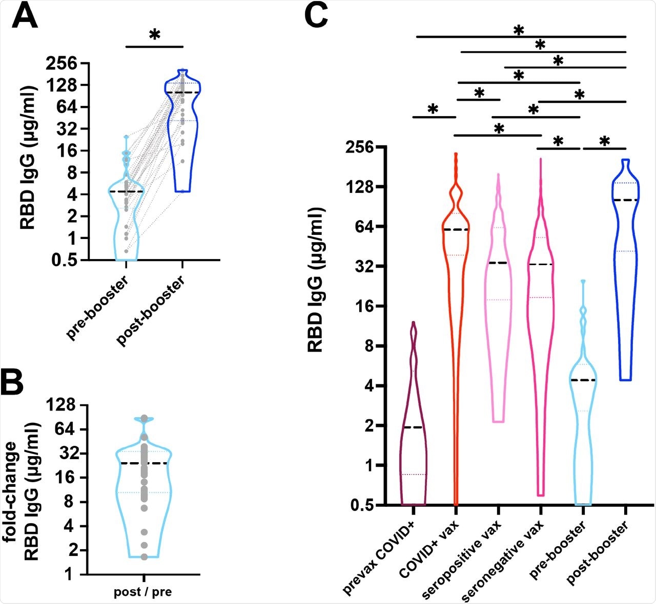 A) Response to COVID-19 mRNA vaccine and booster was measured as anti-RBD IgG antibodies from dried blood spots. Median IgG concentration (black dashed line) increased from 4.4µg/ml pre-booster to 101.6µg/ml post-booster (*p<0.001). Grey dotted lines represents paired samples. n=33. B) There was a median 25-fold change post-booster. C) Median anti-RBD IgG concentration (black dashed line) are shown. Individuals with outpatient COVID-19 had a median of 1.92 µg/ml (n=76) 14-42 days after infection, while individuals with a history of COVID-19 followed by vaccination were higher (60.61µg/ml, n=73, 5-42 days after 2nd dose). Individuals without a known history of COVID-19 who were either seropositive or seronegative and then 2-dose vaccinated had median IgG of 34.15µg/ml (n=181) and 33.09µg/ml (n=687), respectively. Pre-booster levels mean 237.9 days after 2-doses of vaccine were 4.4 µg/ml (n=33) compared to post-booster vaccination level of 101.6 µg/ml (n=33). Dotted lines represent the 25th and 75th percentiles. (*p<0.001).