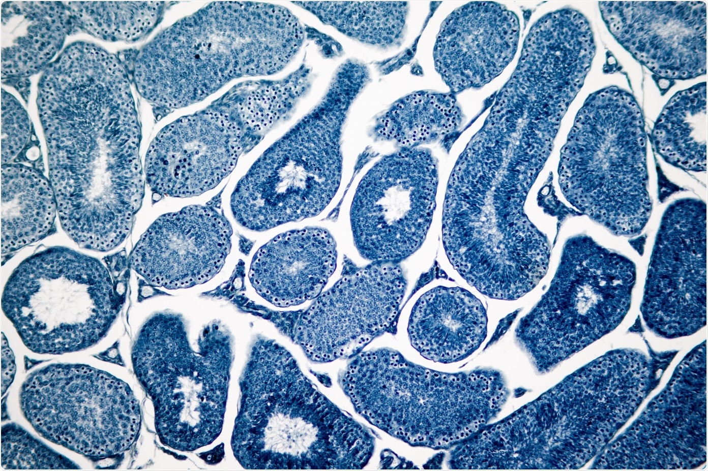 Cross section of human testis under microscope view that shows spermatogonia, spermatocytes in meiosis, spermatids, and spermatozoa. Image credit: AMSBio