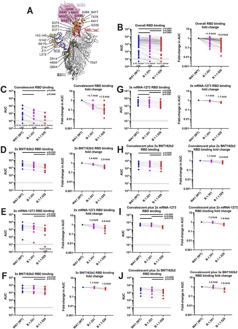A 7.5-fold reduction in antibody binding to the RBD in Omicron was observed in two-thirds of convalescent COVID-19 patients, who showed no detectable activity following ELISA. However, in other groups, the RBD binding was well maintained. Similarly, the antibody binding to NTD was also well maintained with some minor reductions.