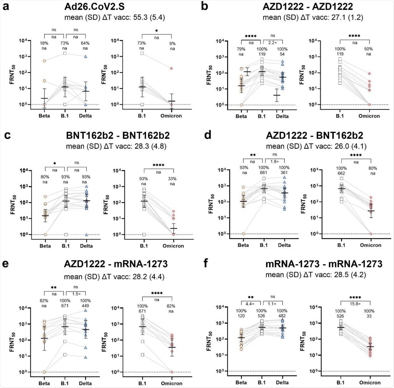 The parental wild-type SARS-CoV-2 strain (B.1) showed a response rate of 73% against Ad26.CoV2.S vaccine. However, when assessed against the Beta and Omicron variants, response rates significantly reduced to 18% and 9%, respectively.