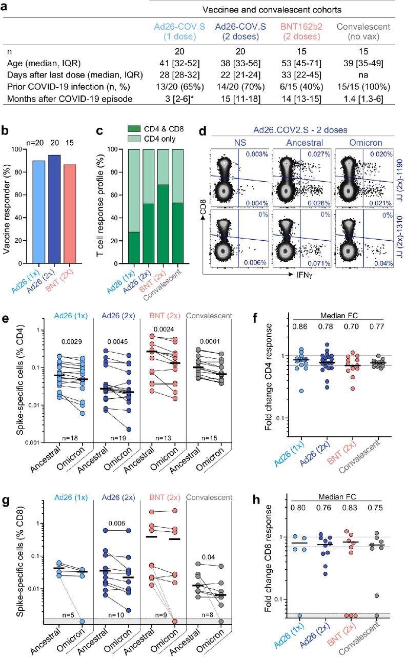 T cell responses were studied in people who had received one or two doses of the Ad26.COV2.S vaccine (Johnson and Johnson/Janssen, n = 20 per group), two doses of the BNT162b2 mRNA vaccine (Pfizer–BioNTech, n = 15), or had recovered from infection. Convalescent donors were investigated after a median of 1.4 months of moderate or asymptomatic illness. T cell responses to vaccination were assessed 22-32 days after the final dose in more than 85% of vaccinees. Immunization and infection both produced spike-specific CD4 T cell responses, while a CD8 response was found less frequently. Intracellular cytokine labeling was used to evaluate cytokine production in response to peptide pools that covered the entire Wuhan-1 spike protein and the Omicron spike.