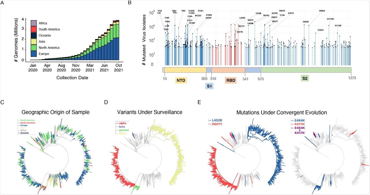 (A) Cumulative count of SARS-CoV-2 genome sequences in GISAID by collection date and the continent of sample origin as of September 26, 2021. (B) Distribution of high-frequency variants in the spike protein sequence. The RBD and NTD domains are highlighted orange and yellow, respectively. For a number of residues with high deviation from wild type sequence (417, 452, 484, 501, 614), the most common mutation is indicated. (C) SARS-CoV-2 maximum-likelihood phylogeny of a high-diversity 1000-genome subset. The tree is an outgroup rooted with the related bat CoV genome RATG13. The root branch length is truncated to emphasize relationships amongst SARS-CoV-2 genomes. The geographic origin of each of the sequences is denoted by branch color. (D) Distribution of haplotypes of the 4 variants of concern (alpha, beta, gamma, delta), mapped onto the phylogeny. (E) Distribution of mutations under convergent evolution (L452R, E484K), mapped onto the phylogeny.