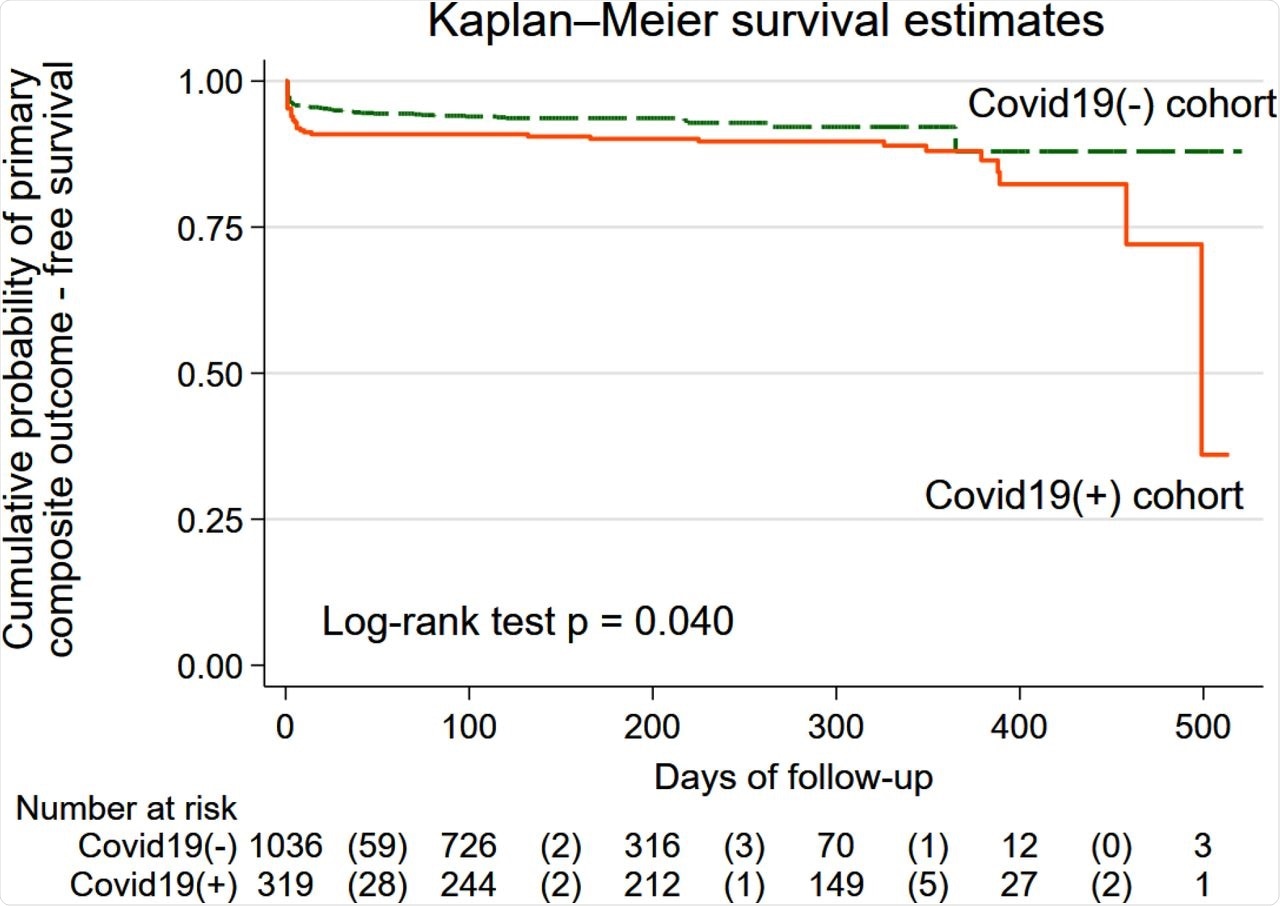 In an unadjusted survival analysis and unadjusted Cox regression analysis, COVID-19(+) patients had a significantly higher probability of developing the primary composite outcome than COVID-19(-) patients. The estimated average time to the primary composite outcome in the COVID-19(+) cohort were tested COVID negative was 148.5 days or approximately 4.9 months.