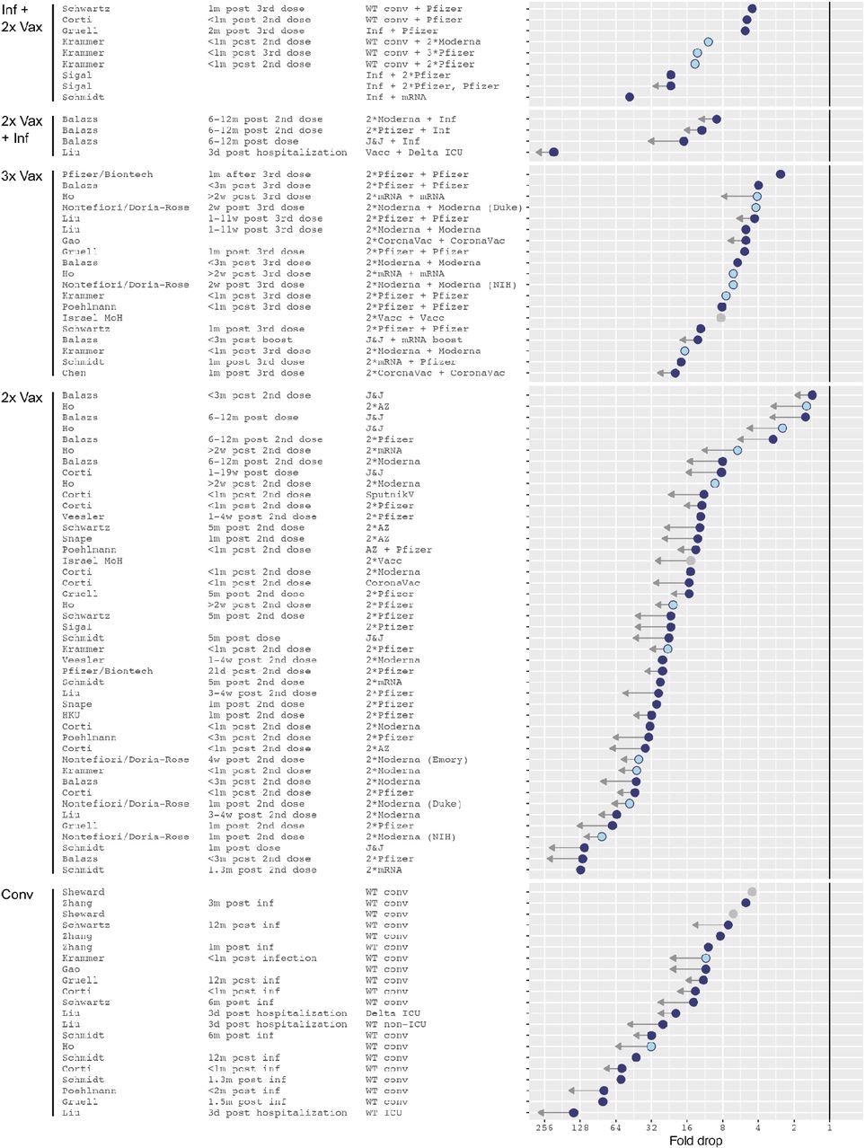 Omicron fold drops relative to wild type. Arrows indicate uncertainties in the point estimate due to titers below the limit of detection (LOD) of the assay. A short arrow marks measurements with less than half of Omicron titers below the assay’s limit of detection (LOD), or conversely reference antigen titers at or higher than the LOD. Long arrows mark measurements with more than approximately 80% of Omicron titers below the LOD. Light blue dots show NIH SAVE laboratories, gray dots mark data points for which the reference antigen was not stated in the manuscript and is here assumed to be Wu-1. The solid vertical line marks no fold change.