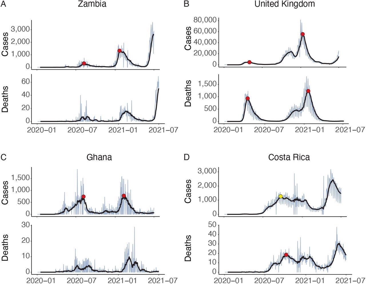 Identification of epidemic waves of COVID-19. A: Zambia shows a clear structure with two waves (red circles) in the cases data, while no waves are identified in the deaths data. B: the UK shows a structure that might arguably have two or three waves, but sub-algorithm D combines the final two. C: In Ghana sub-algorithm B filters out an early spike in cases. It is not clear visually whether this is noise or a meaningful epidemiological event; the algorithm cannot do better than the reader in determining this from simply inspecting a graph. No waves in deaths are identified due to low absolute counts. D: The number of cases in Costa Rica does not fall by 70% after the first wave, so it is not identified by the algorithm as a wave. This shows how important the parameter Prel can be. However, cross-validating against the time series of deaths allows the wave to be identified (yellow circle)