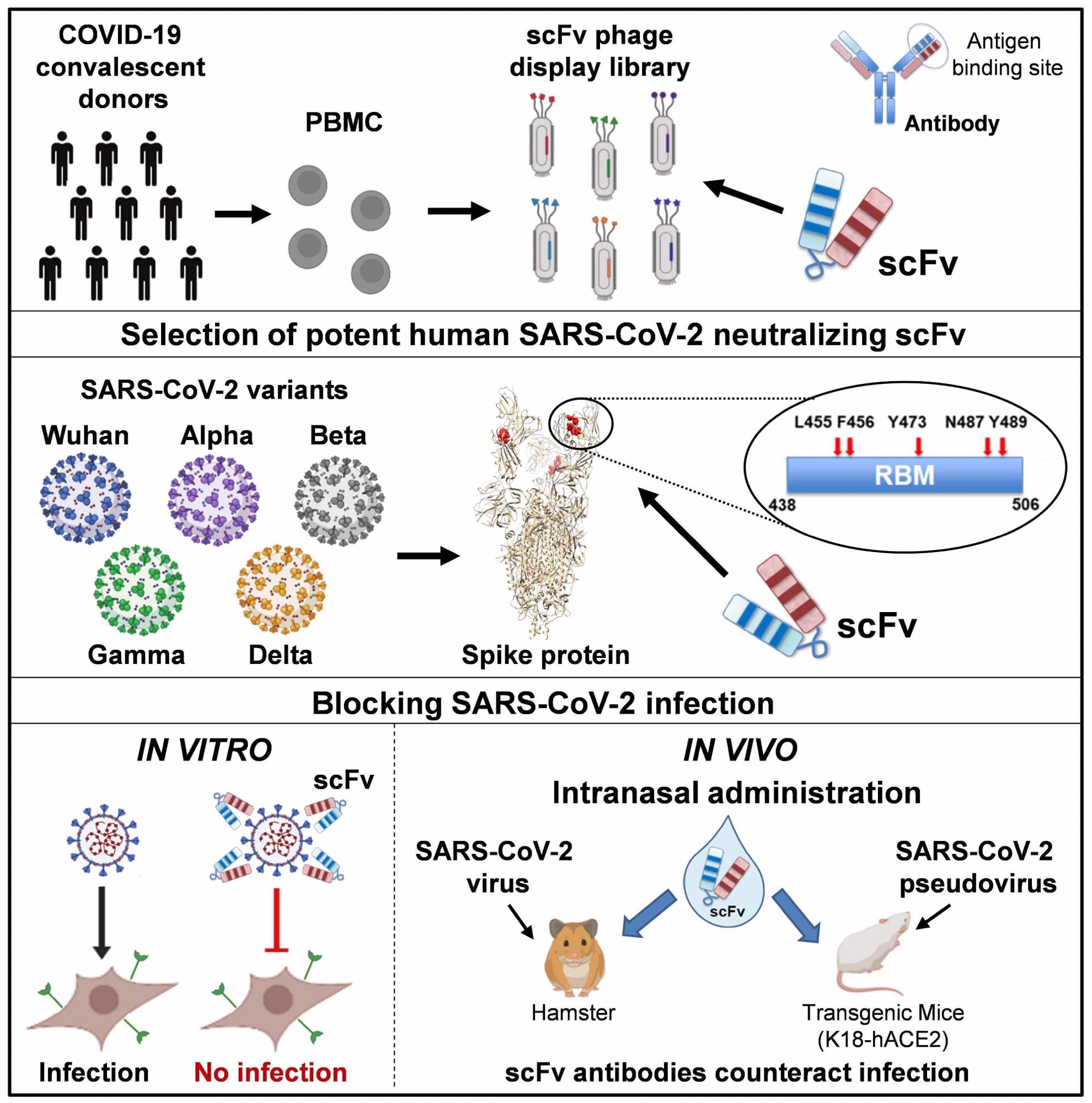 All 76clAbs recognize the native SARS-CoV-2 spike protein and block its binding with the human angiotensin-converting enzyme 2 (hACE2) receptor, but not the other scFv antibodies. Except for scFv76-55, all 76clAbs accommodated Delta variant mutations and other VBM mutations without losing their neutralizing activity.