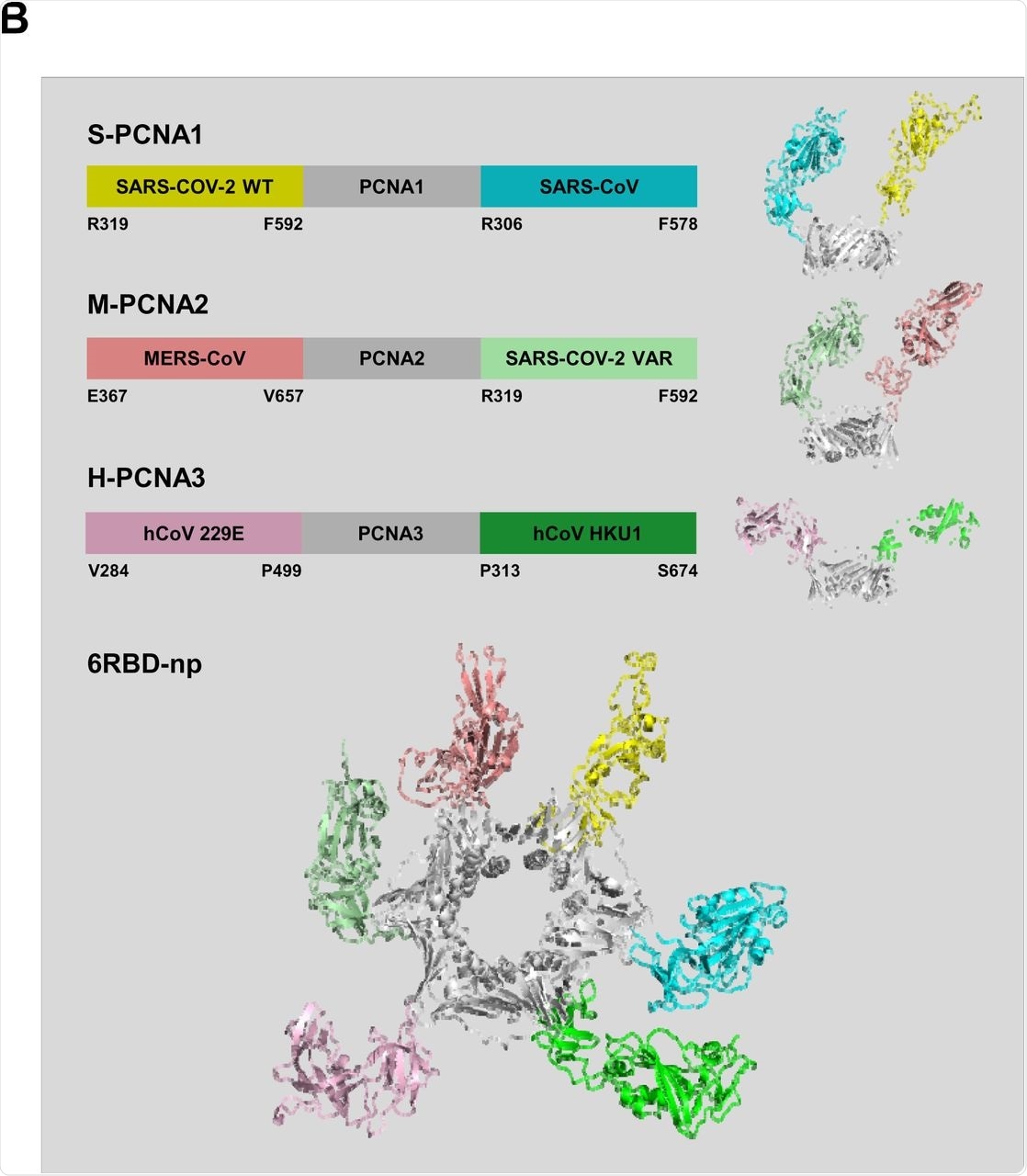 The construction of the three plasmids S-PCNA1, M-PCNA2, and H-PCNA3 were based on the fusion protein sequences obtained from the SARS-CoV-2, Middle East Respiratory Syndrome CoV (MERS-CoV), and human CoV HKU1 (HKU1), respectively. S-PCNA1, M-PCNA2, and H-PCNA3 were isolated using His-tag affinity, ion exchange, and size exclusion chromatography after being expressed in HEK 293F cells.