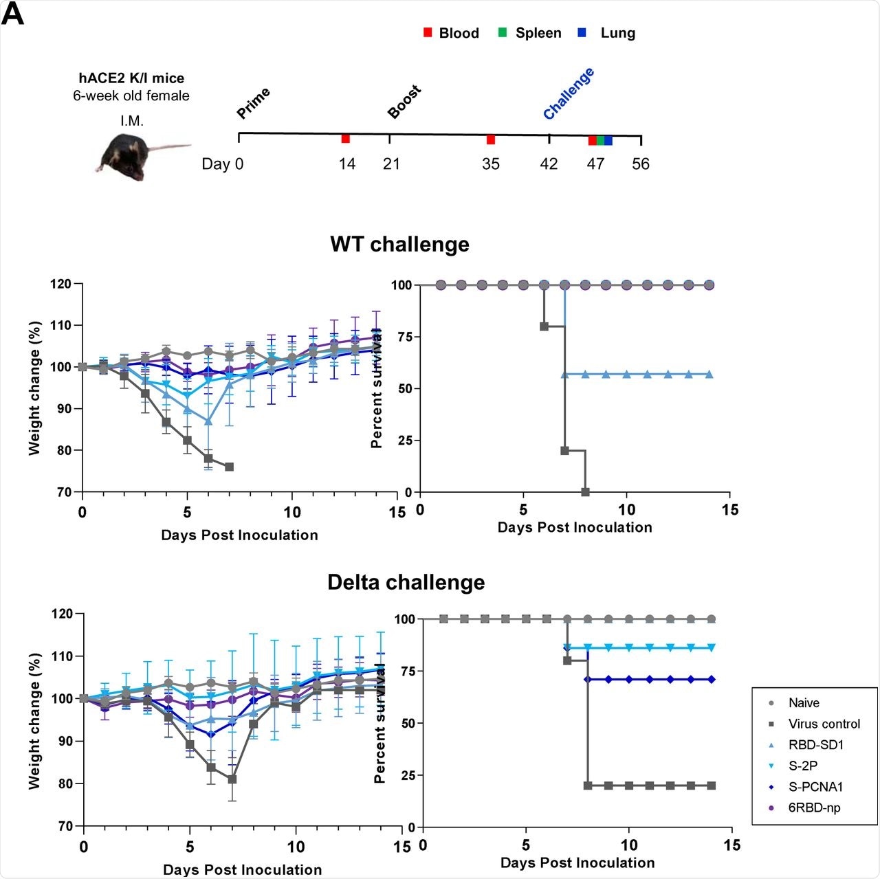 Mice that were genetically engineered to express the human angiotensin-converting enzyme 2 (hACE2) receptor, which is required for cellular entry of SARS-CoV-2, were then treated with two immunizations at three weeks apart. Forty-two days after their first dose, all mice were challenged with an intranasal inoculation of SARS-CoV-2 wild-type (WT) or Delta.
