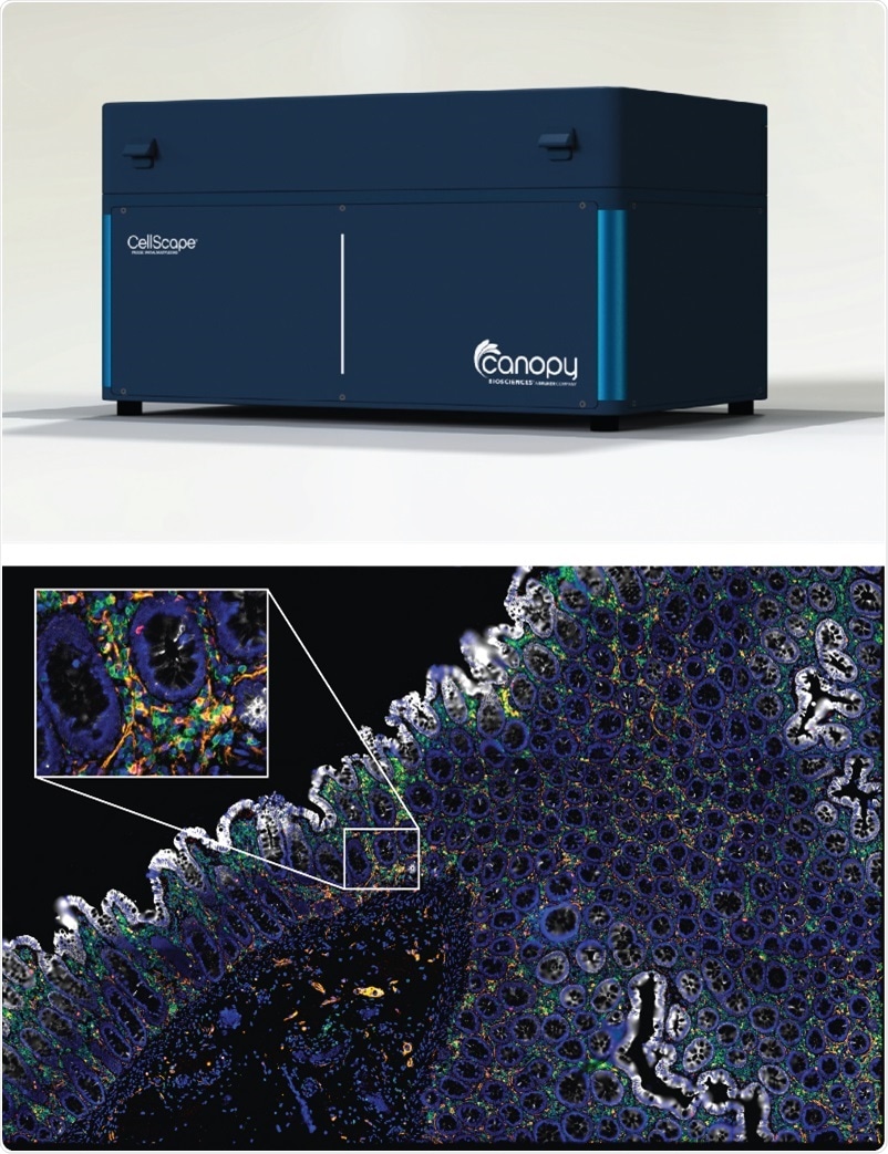 CellScape instrument for high-plex, targeted spatial proteomics (top). High-plex image of FFPE colorectal tissue stained and imaged with ChipCytometry (bottom). Inset shows magnification with subcellular resolution. Image Credit: Canopy Biosciences, a Bruker Company